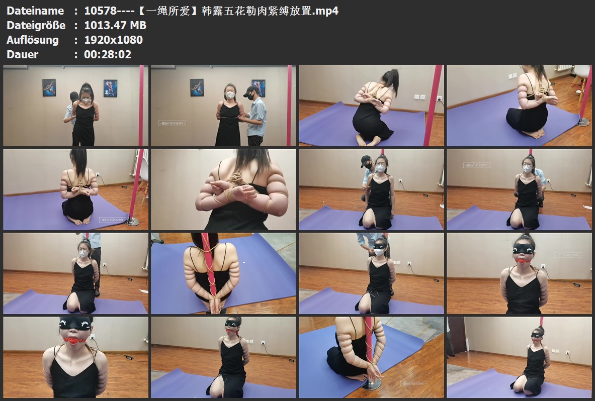 韩露五花大绑跪在地上,口球堵嘴,手背相对,捆绑在钢管上,放置