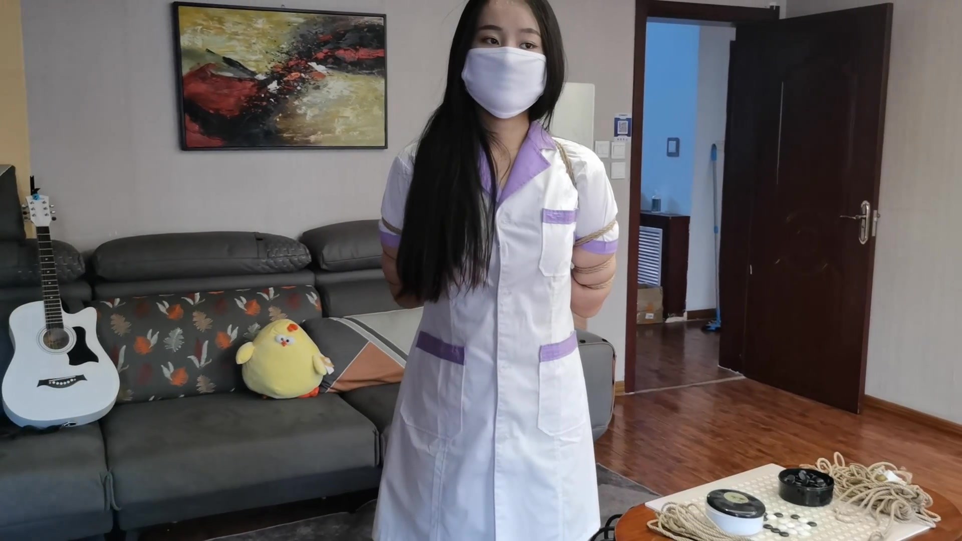 五花大绑绳艺捆绑教学,小花影身着护士服,护士小白鞋,为大家拍摄绳艺教学,没想到拍摄过程中,保洁阿姨进来打扫卫生