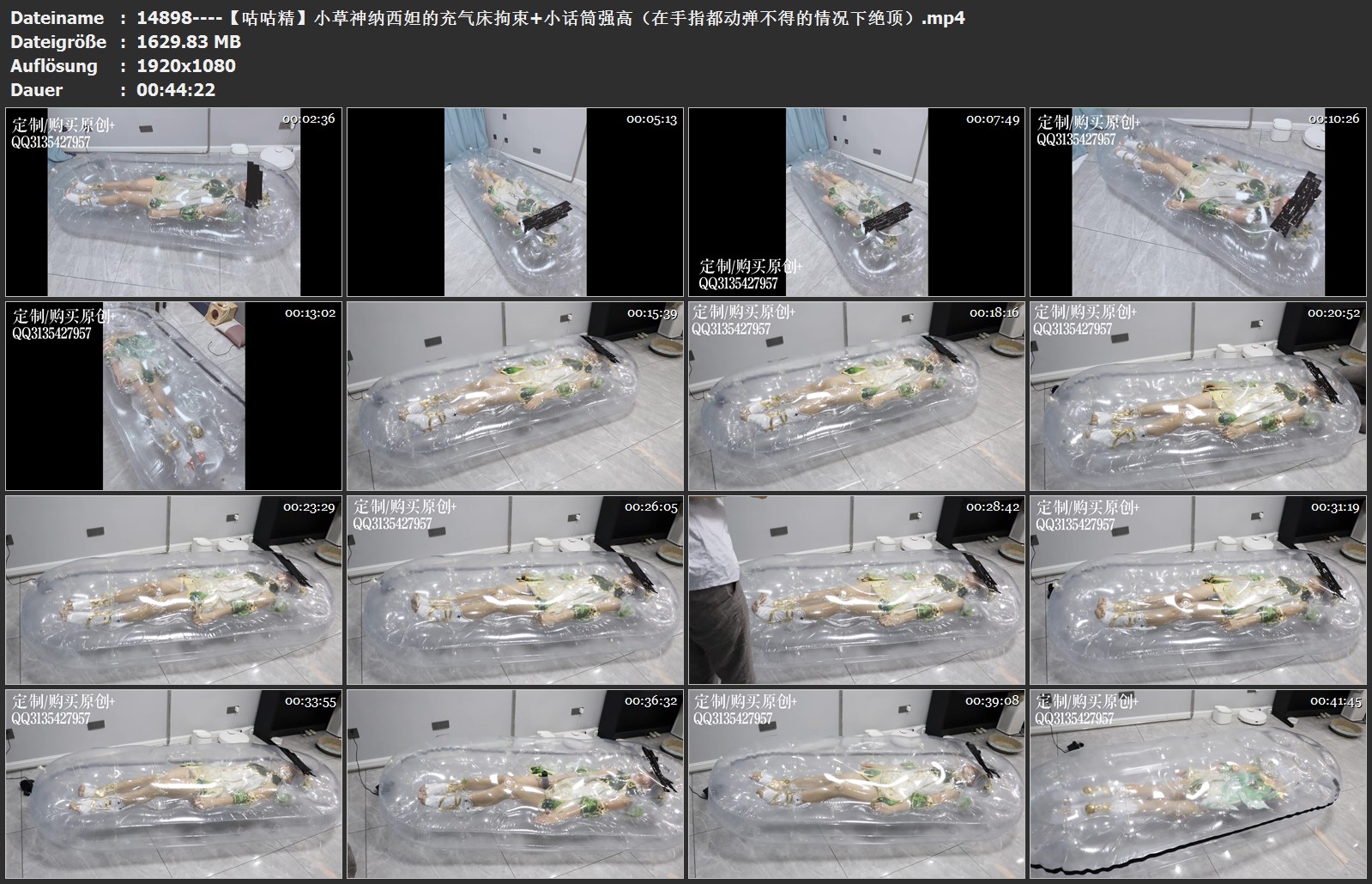 充气床的效果不用多说,一旦充满气就会被柔软的胶膜紧紧压住每一寸皮肤~连手指都动弹不得~(会发脚趾被压住的特写),被封印在里面的填充物只能像秋千一样带动着充气床整体轻微摇晃~