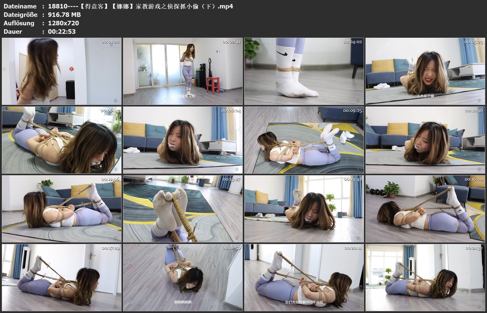 娜娜费劲千辛万苦终于找到了一把剪刀,可在她拿到剪刀的一瞬间,小杰从她手里将剪刀夺走。为了防止美丽调皮的娜娜老师再次想办法逃走,小杰将娜娜牢牢地绑成了驷马束缚。娜娜扭动着身体,发现自己再也无法站起身蹦跳,也无法挣脱身上的绳子。她能做的,只是威胁小杰给她松绑,否则将会告状。娜娜的威胁激怒了小杰,他用袜子堵住了娜娜的嘴,并且用透明胶带把娜娜的嘴巴封死,这样,娜娜老师就没办法说话,也不能威胁到他了。被强行堵上嘴的娜娜非常愤怒,她不停地呜呜呜叫着,扭动着身体想要挣脱绳子的束缚,可是无论她怎么努力,也无法摆脱被捆绑和被堵嘴的命运。更糟糕的是,小杰意识到了娜娜穿着白袜的脚还有一定的活动空间,所以他用另外一根绳子,将娜娜的大脚趾隔着白袜绑在一起,并且拉紧连接到上半身。这样,娜娜的白袜脚只能保持绷直的状态。可怜的娜娜老师现在已经被绑得动弹不得,但是她还是很努力地在地上蠕动,企图朝着大门的方向移动。终于,过了很长一段时间,家长回家了。家长开门的一瞬间就看到被绑成粽子趴在地上的娜娜。他连忙把娜娜的嘴松开,问是不是有贼闯进了家中。娜娜委屈地说自己是被小杰绑成这样的,暴怒的家长立马冲进房间去收拾小杰,他好像忘了一件什么事——我们可爱的娜娜老师,依然还被绳子紧缚着,她扭动着身子在地上大声呼喊着,能不能先帮自己松绑......