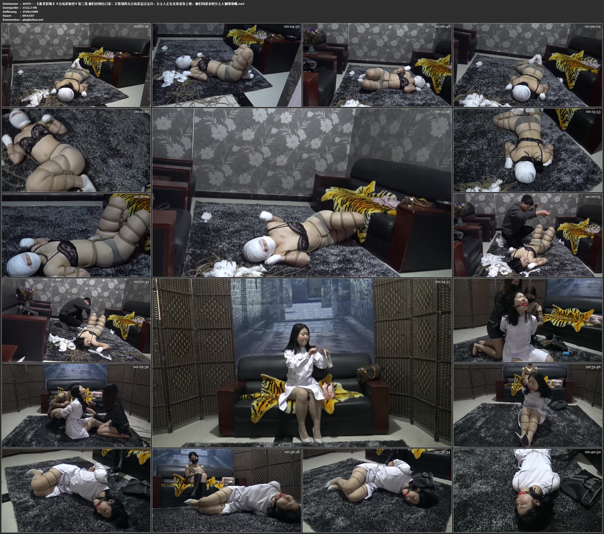 她们把女主人扒衣四肢被折叠捆绑头被绷带包裹着趴在地上挣扎她们离开,男主人回到家看到两女贼跑了把女主人捆绑了,她们回到自己家,又筹划再去古玩家盗点宝贝,女主人正在化妆准备上班,她们闯进来把女主人捆绑堵嘴,女主人结局怎么样,请欣赏视频