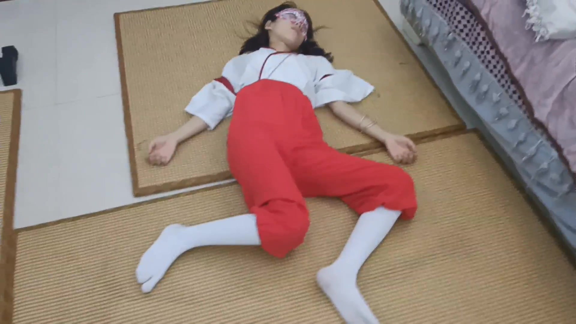 琳媚主演,女巫服搭配长筒分趾白袜,腹部受伤跪地哭泣呻吟,虚脱倒地,最后昏厥