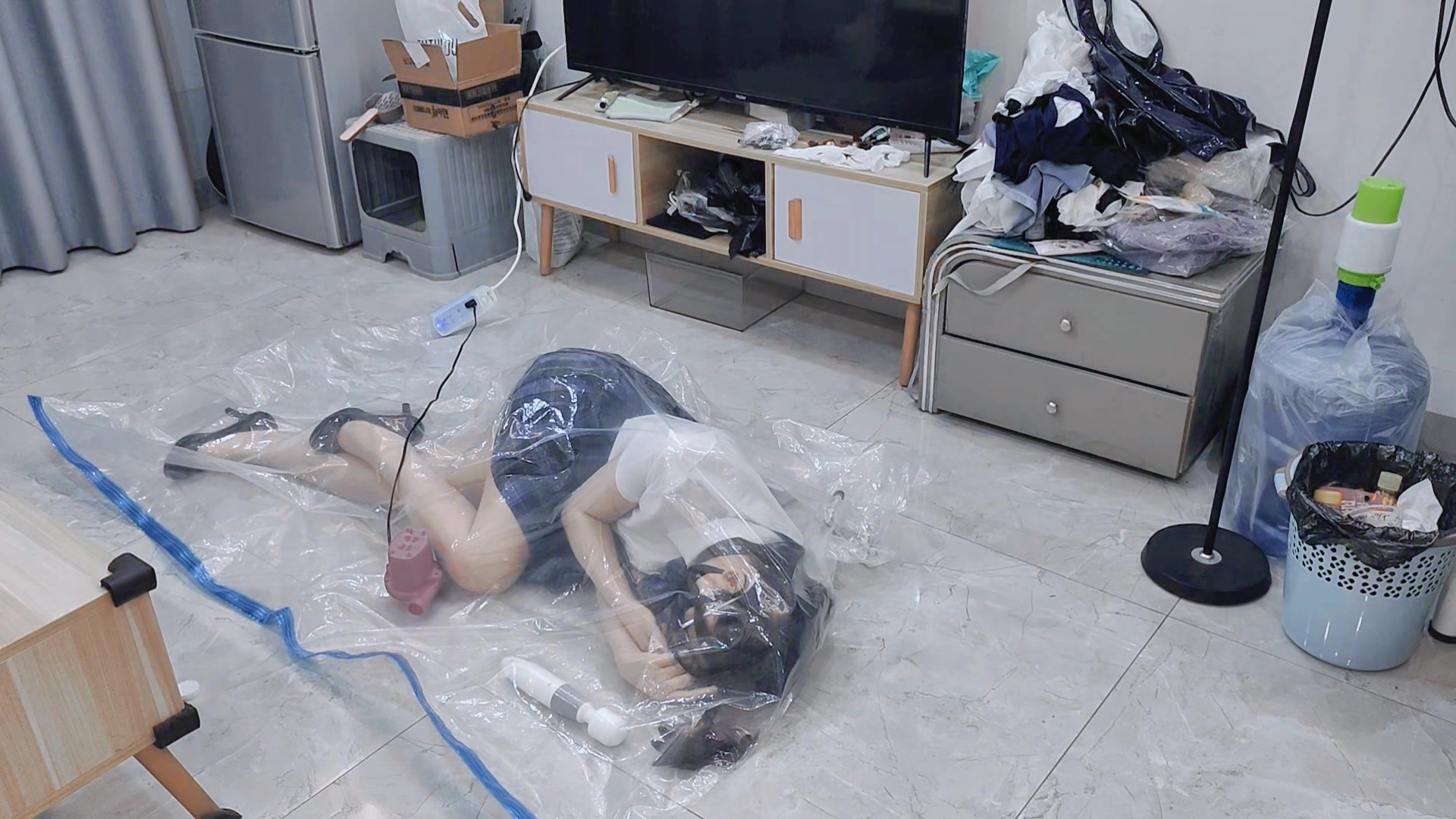 少女戴着项圈与新款玩具进到真空袋中定时调控抽真空打包