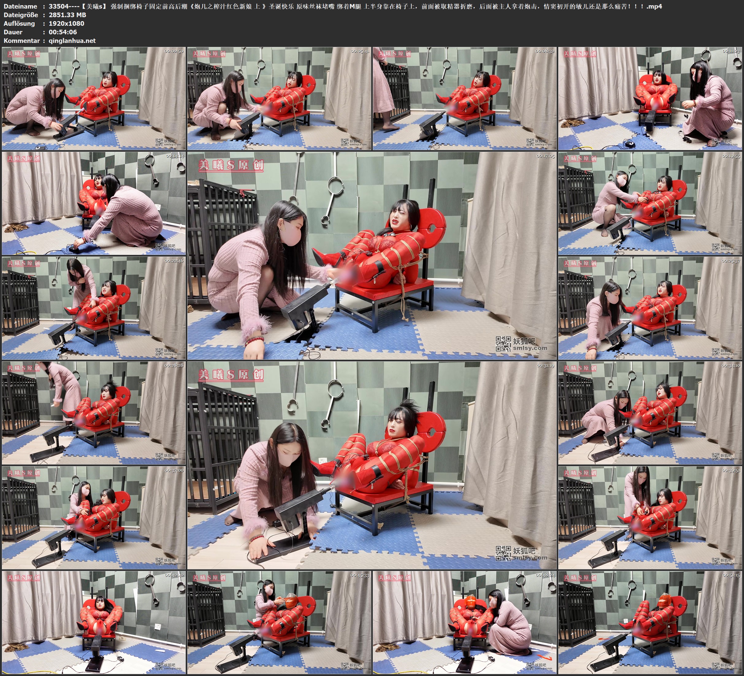 诞虽然都在穿圣诞服,我看穿一身红色的连体丝袜也是不错,穿着JJ套丝袜,绑着M腿放在了椅子上四周都固定了起来,全身上下动一下也是非常费劲,只能乖乖的接受主人的玩弄了,红色的高跟鞋也是非常的亮眼!在主人拧开炮几开关的一瞬间敏儿可谓是痛苦的表情随即加深,一阵撕叫,但是并不影响主人对敏儿的惩罚,强制捆绑在椅子上,你说还能反抗什么呢? 一阵一阵的炮几轰炸下,已经是筋疲力尽了,然后主人给敏儿放上了取精器榨汁,咦~~~看来你是被炮几干费了呀!!怎么这都软软的 还出来很多骚水, 原来是在主人炮几的轰炸下,估计不知道什么时候敏儿就这么释放了,估计是她当时也不知道把!主人说着就把取精器继续固定上,既然[X_X]了再让你来一次,敏儿露出了痛苦的表情,只能乖乖受罚了,虽然现在还是有点软,等会儿应该还能榨取, 这时候主人拿着穿过的原味丝袜给敏儿塞进了嘴里,紧接着套上了丝袜头套,然后在外面在拿着胶带封了一圈,把头也包了起来,敏儿在视觉上失去的同时,变的更加紧张了,看也看不到了,谁知道主人下一步会是对她做什么,一切都是未知数。在心理学上未知的东西是最害怕的,反过来说也是最期待的把!就这样又开始了轮番轰炸,等待着敏儿的还会有什么惩罚呢?