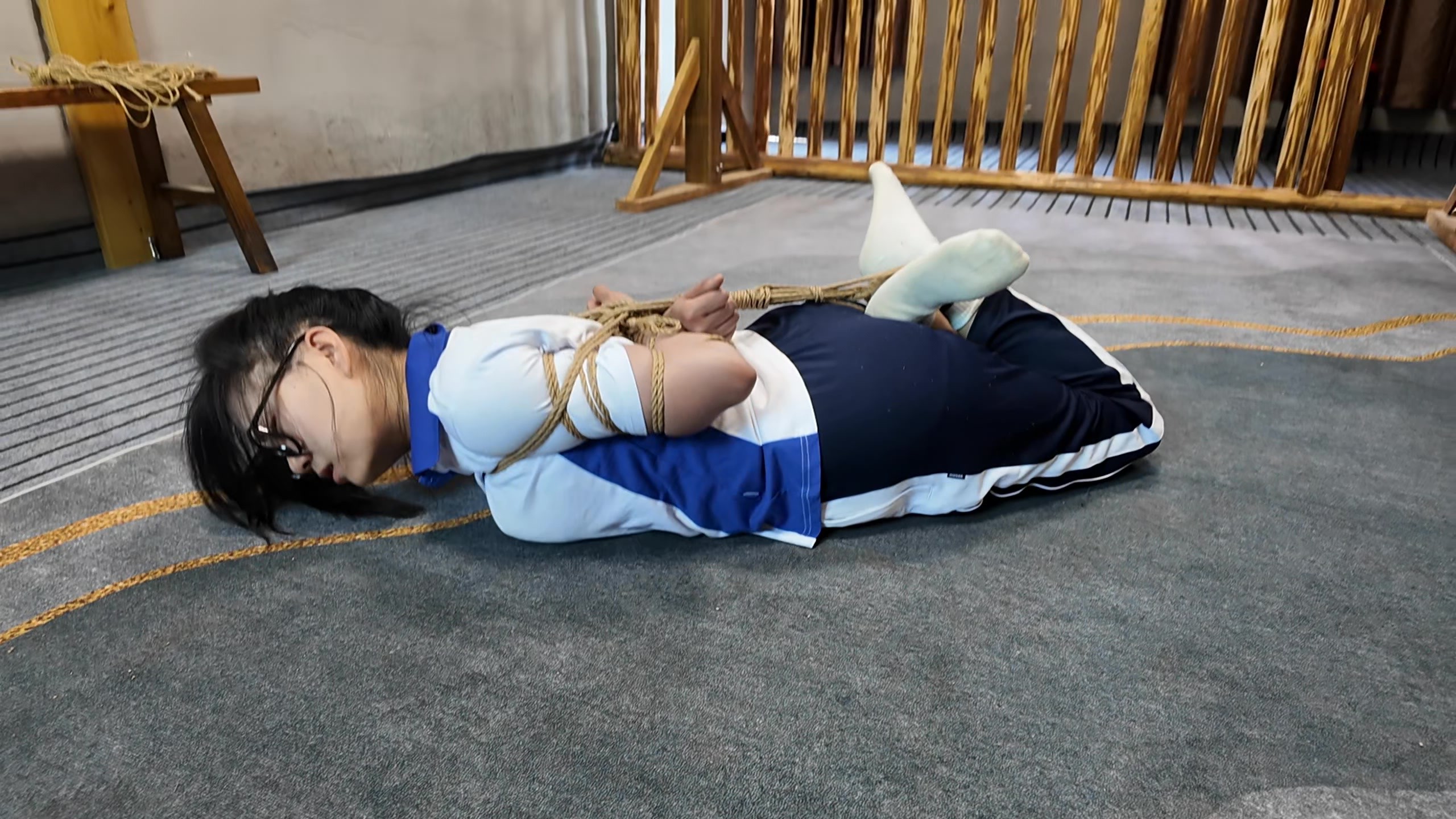 小遥逃学,被教官抓回管教,先吊到树上,又绑到椅子上面打屁股,又吊起来放置,没想到小遥自己慢慢解开,刚想逃跑,又被抓回,这下驷马紧缚,看她还跑不跑,罚深蹲,蛙跳
